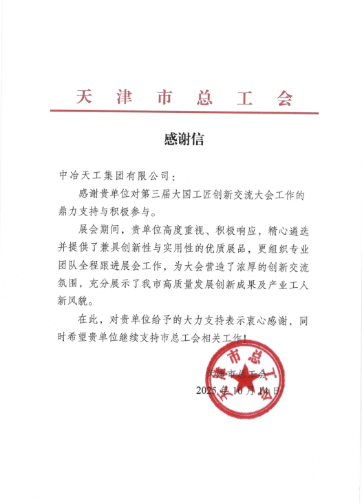 近日,工程技術(shù)總院收到天津市總工會(huì)致中冶天工感謝信。信中對(duì)中冶天工在第三屆大國工匠創(chuàng)新交流大會(huì)暨大國工匠論壇“五小”成果展示中的鼎力支持與積極參與給予充分肯定,對(duì)公司展品的“兼具創(chuàng)新性與實(shí)用性”以及專業(yè)團(tuán)隊(duì)“全程高效保障”表示高度贊賞,展現(xiàn)了天津高質(zhì)量發(fā)展創(chuàng)新成果及產(chǎn)業(yè)工人新風(fēng)貌,為大會(huì)營造濃厚創(chuàng)新交流氛圍注入了關(guān)鍵力量。