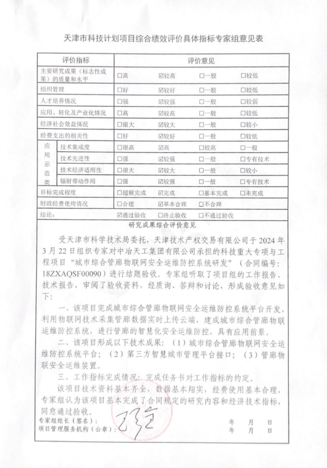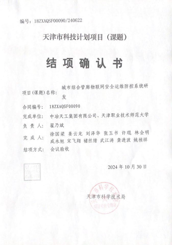 近日,由中冶天工承擔(dān)的天津市科技計(jì)劃項(xiàng)目《城市綜合管廊物聯(lián)網(wǎng)安全運(yùn)維防控系統(tǒng)研發(fā)》通過(guò)結(jié)項(xiàng)驗(yàn)收。該項(xiàng)目歷經(jīng)數(shù)年艱苦攻關(guān),系統(tǒng)地解決了基于物聯(lián)網(wǎng)技術(shù)的地下綜合管廊及管線在運(yùn)行使用過(guò)程中的風(fēng)險(xiǎn)評(píng)估和安全監(jiān)管問(wèn)題,并取得了一系列重要的科研成果,為推動(dòng)管廊運(yùn)維技術(shù)領(lǐng)域的進(jìn)步和產(chǎn)業(yè)發(fā)展作出了重大貢獻(xiàn)。